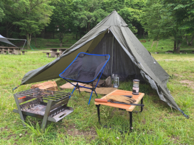 | テント | BUNDOK ソロティピー1 + 鍛造ペグ + ペグハンマー | 設営が簡単・前室広めで荷物や焚き火道具を収納可 |